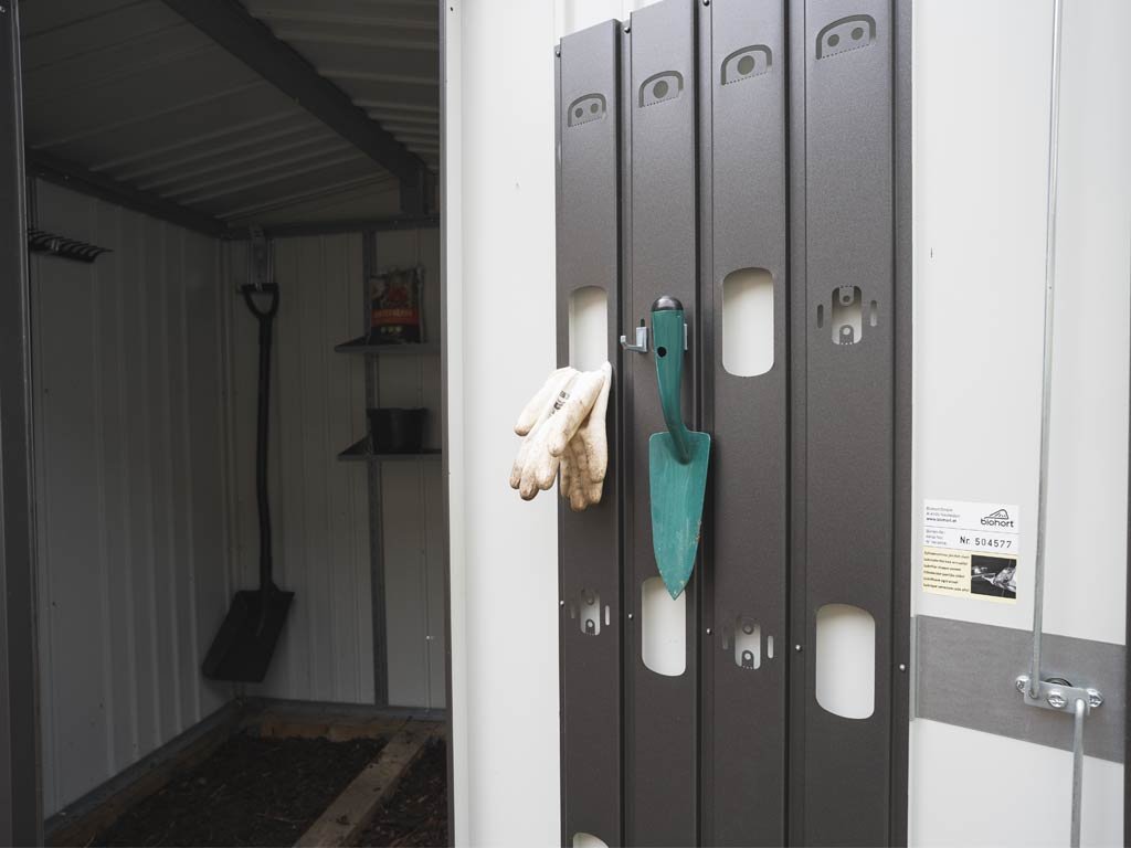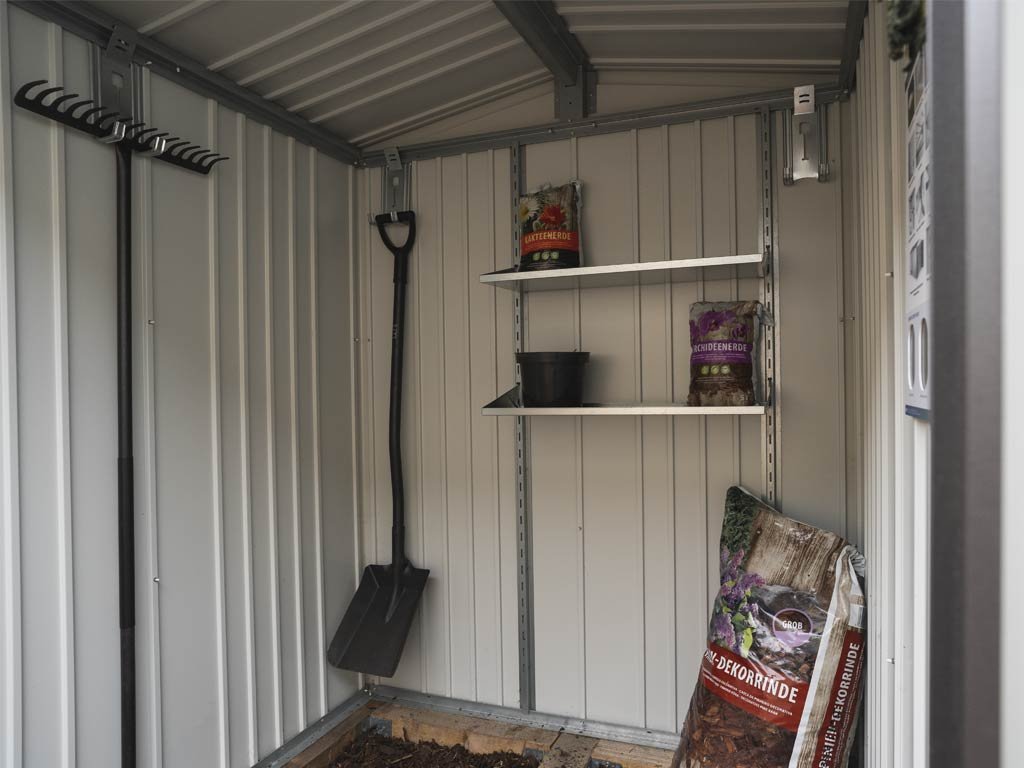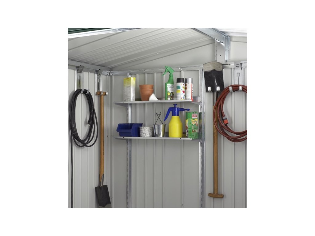 Sada polic a regálových stojen změní váš zahradní domek Biohort na přehledný sklad. Police jsou individuálně polohovatelné. Standardní hloubka je 24,5 cm. Šířka police je 72 cm. Policová sada je žárově pozinkovaná, aby byla zajištěna dlouhá životnost. Snadno se instaluje a vydrží zatížení až 15 kg na polici. Pro všechny, kteří potřebují uložit mnohem více věcí, nabízíme polici s hloubkou 43,5 cm, kterou si můžete dokoupit v bohaté nabídce volitelného příslušenství.