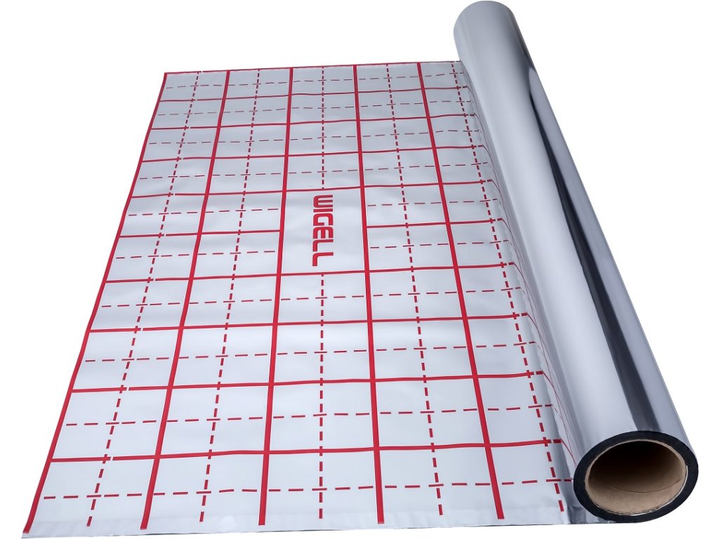 Folie Wigell pod podlahové topení o tloušťce 1,02 mm je podlahová parotěsná fólie z polyethylenu s reflexní metalizovanou hliníkovou vrstvou. Folie je potištěna rastrem po 5 cm, v červené barvě, pro snazší instalaci trubky. Rozměry role 1,05 x 50 m.