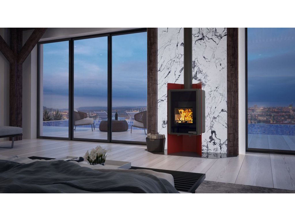 Luxusní krbová kamna Pulau s výkonem 9 kW v červené barvě. Vytápěcí schopnost kamen činí až 220 m3, horní vývod kouřovodu, průměr vývodu 150 mm. S externím přívodem vzduchu. Síla plechu 3 a 5 mm. Důraz na design a nové technologie.