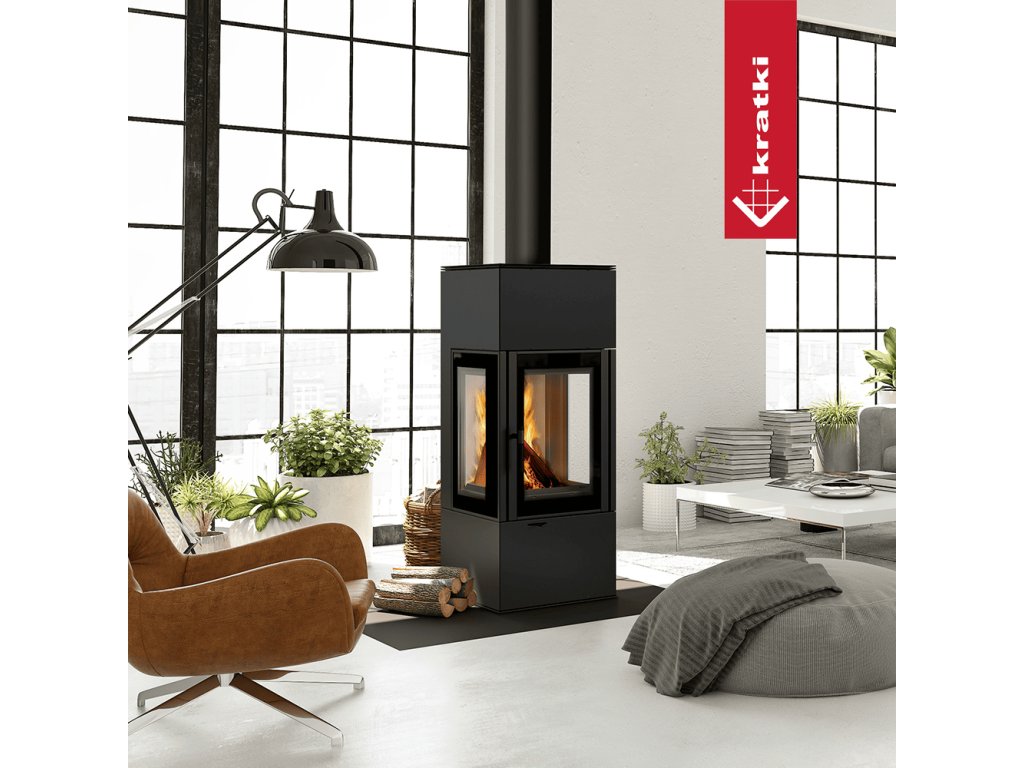 Krbová kamna Kratki THOR s výkonem až 10 kW, černou barvou a horním vývodem kouřovodu o průměru 150 mm kombinují moderní design s velkým panoramatickým prosklením, které umožňuje intenzivní pohled do plamenů, a efektivní spalování s minimem emisí, díky čemuž poskytují komfortní a ekologické vytápění každého interiéru.