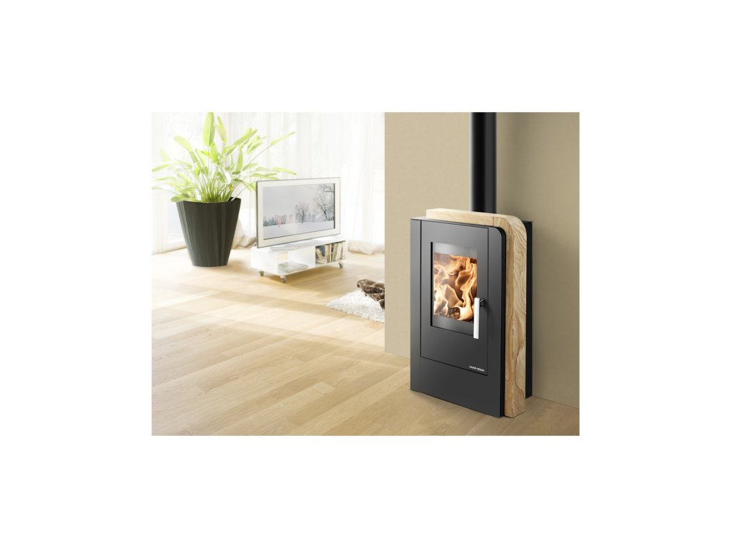 Krbová kamna Haas+Sohn NORDBY v černé barvě zdobí elegantní půlměsíc z přírodního kamene Woodstone Prestige. Neopakovatelná kresba přírodního pískovce dělá z každých kamen jedinečný originál. Kamna jsou vhodná do malých prostor, protože mají hloubku pouhých 37 cm a odstup od zdi stačí 5 cm. Moderní design s elegantními zaoblenými hranami zapadne do každého interiéru.