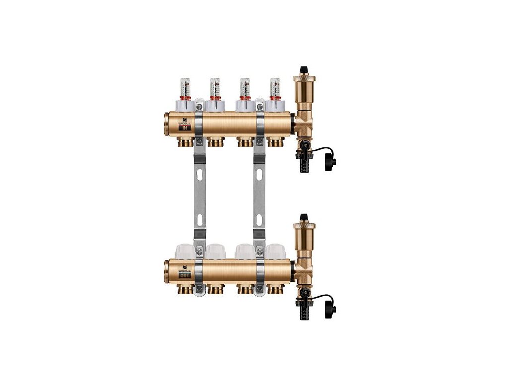 Podlahový rozdělovač WIGELL, 4 okruhy, mosazný + automatické odvzdušňování