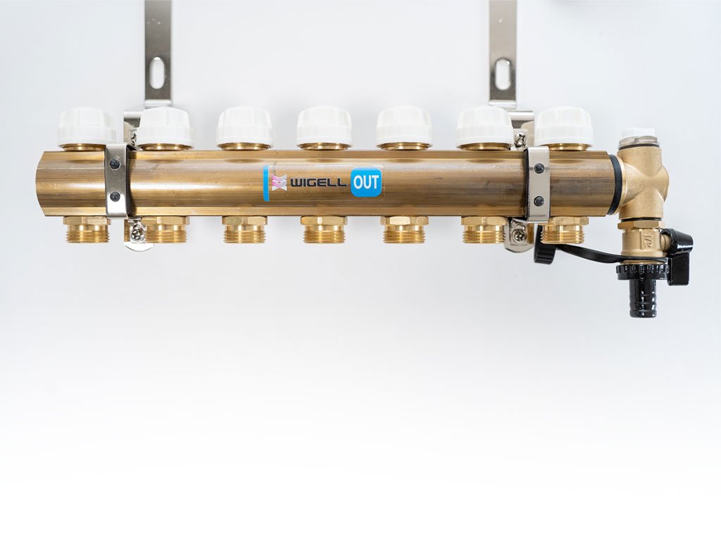 Podlahový rozdělovač WIGELL, 7 okruhů, mosazný + odvzdušňování na klíč