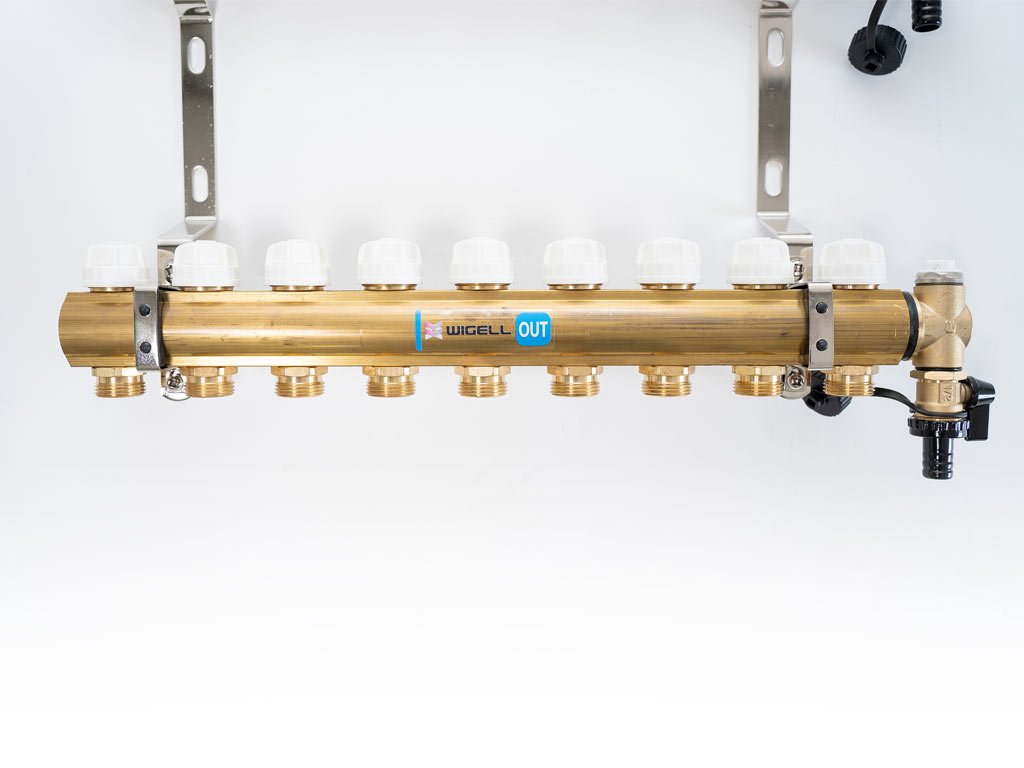 Podlahový rozdělovač WIGELL, 9 okruhů, mosazný + odvzdušňování na klíč