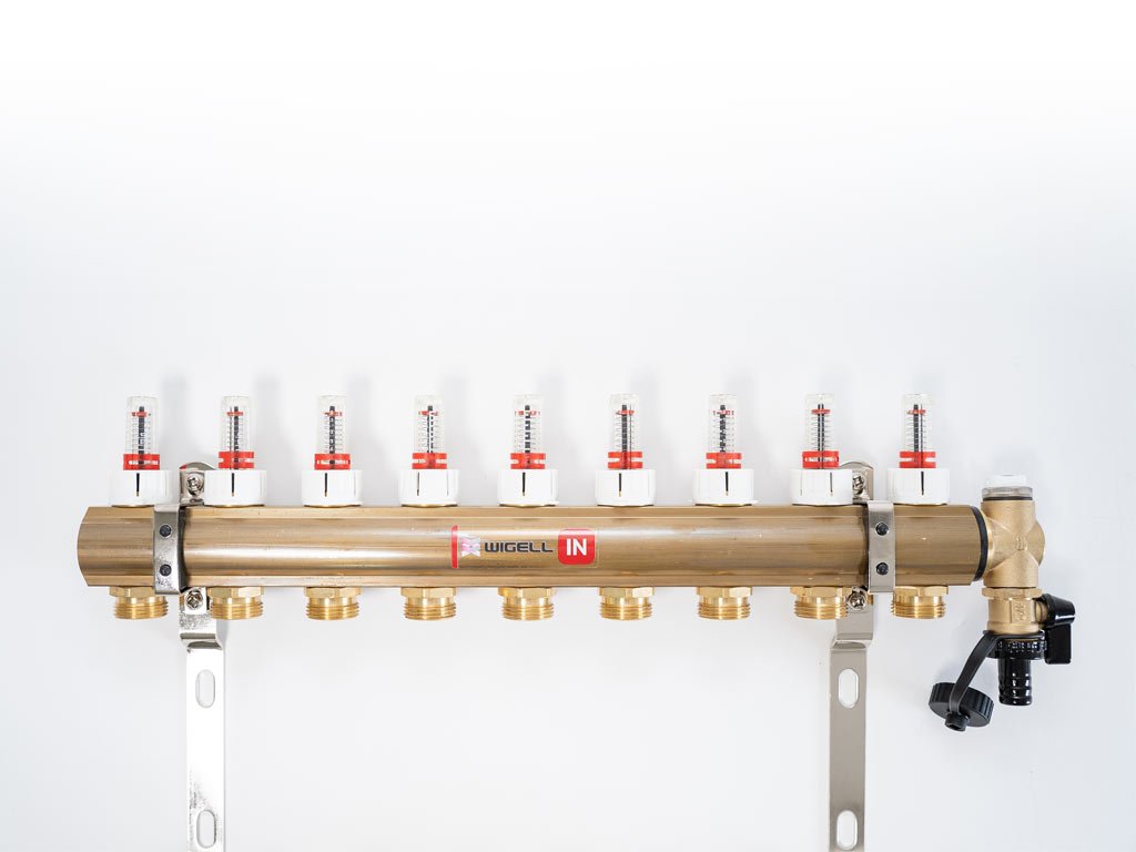 PROFI mosazný rozdělovač s 9 okruhy a manuálním odvzdušňovačem je určený pro podlahové vytápění. Všechny rozdělovače mají provedenou tlakovou zkoušku. Součástí rozdělovače jsou průtokoměry, odvzdušňovače a regulační ventily. Rozdělovače jsou osazeny 1" kulovými kohouty se šroubením a vnitřním závitem pro připojení.