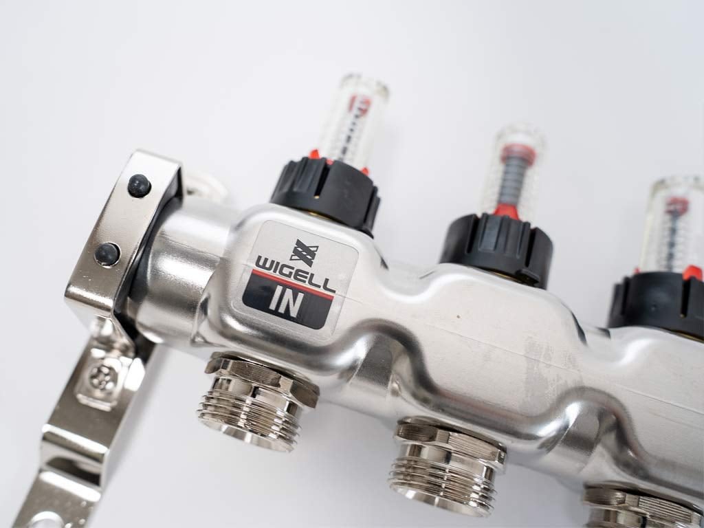 Rozdělovače Wigell lze namontovat přímo na stěnu nebo pomocí dodaných držáků do skříně rozdělovače. Montážní poloha je libovolná. Na tento rozdělovač můžete pomocí svěrného šroubení připojit trubky PeX-AL-PeX nebo Pe-rt.