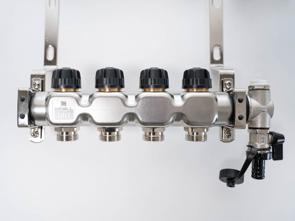 Rozdělovače Wigell lze namontovat přímo na stěnu nebo pomocí dodaných držáků do skříně rozdělovače. Montážní poloha je libovolná. Na tento rozdělovač můžete pomocí svěrného šroubení připojit trubky PeX-AL-PeX nebo Pe-rt.
