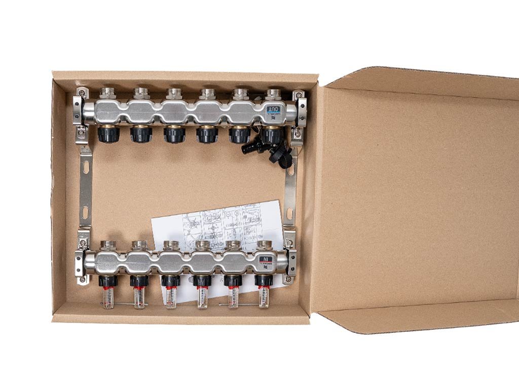 PROFI nerezový rozdělovač se 6 okruhy a manuálním odvzdušňovačem je určený pro podlahové vytápění. Všechny rozdělovače mají provedenou tlakovou zkoušku. Součástí rozdělovače jsou průtokoměry, odvzdušňovače a regulační ventily. Rozdělovače jsou osazeny 1" kulovými kohouty se šroubením a vnitřním závitem pro připojení.
