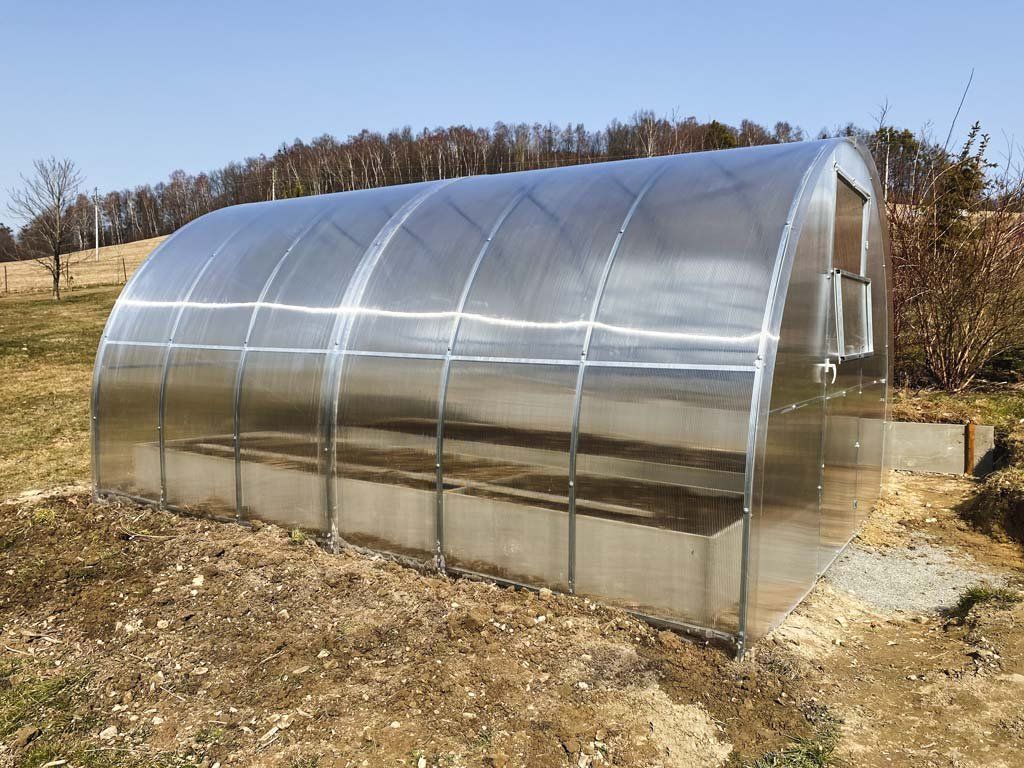 Zasklení skleníku je tvořeno čirým dutinkovým (komůrkovým) polykarbonátem o tloušťce 4 mm s UV ochranou díky které nekřehne a nežloutne. Polykarbonát je certifikovaný a splňuje veškeré podmínky zdravotní nezávadnosti.
