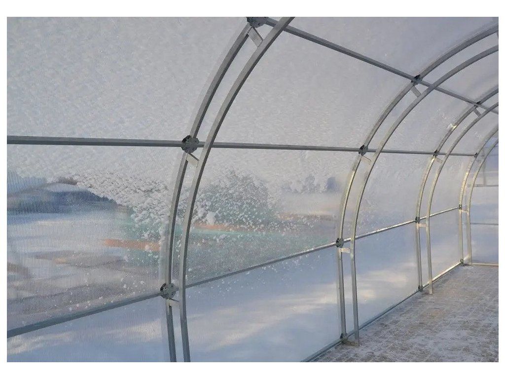 Zasklení skleníku je tvořeno čirým dutinkovým (komůrkovým) polykarbonátem o tloušťce 4 mm s UV ochranou díky které nekřehne a nežloutne. Polykarbonát je certifikovaný a splňuje veškeré podmínky zdravotní nezávadnosti.