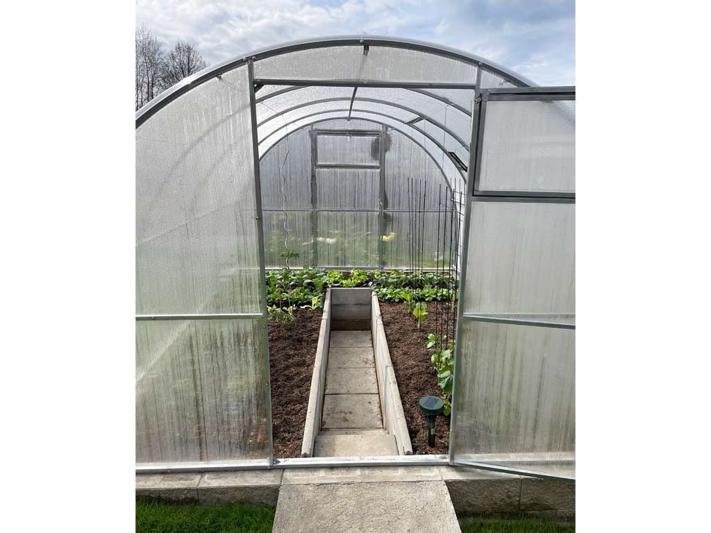 Zasklení skleníku je tvořeno čirým dutinkovým (komůrkovým) polykarbonátem o tloušťce 6 mm s UV ochranou díky které nekřehne a nežloutne. Polykarbonát je certifikovaný a splňuje veškeré podmínky zdravotní nezávadnosti.