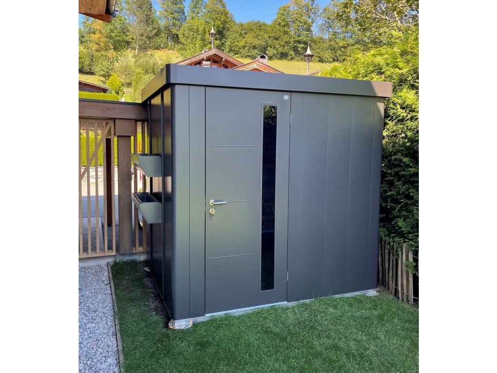 Rakouský domek NEO v barvě tmavě šedá metalíza. Rozměry 180 cm x 180 cm, zesílené 0,5 mm plechové stěny, jednoduché dveře se zámkem. Široká základní i doplňková výbava, 20letá záruka.