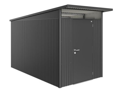 Stabilní kovový domek na nářadí AVANTGARDE® A4 v prémiové kvalitě s pultovou střechou, v provedení šedý křemen s jednokřídlými dveřmi. Vnější rozměry š 180 x d 380 cm....
