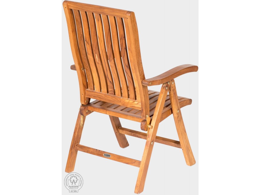 Masivní skládací křeslo Riva ovýšce 110, šířce 60 a hloubce / délce 65 cm je vyrobené z kvalitního indonéského teaku.Pevnost, stabilita a design řadí tento typ křesla mezi nejkvalitnější na českém trhu. Na špičkové úrovni je především dílenské zpracování, zesílené nohy, zesílení rámu sedáku i opěradla, které bylo pečlivě anatomicky natvarováno pro vaše větší pohodlí. Zahradní křeslo Riva se velice snadno polohuje a lehce skládá. Samozřejmostí je i kvalitní mosazné kování. Nosnost teakového křesla je 150 kg.