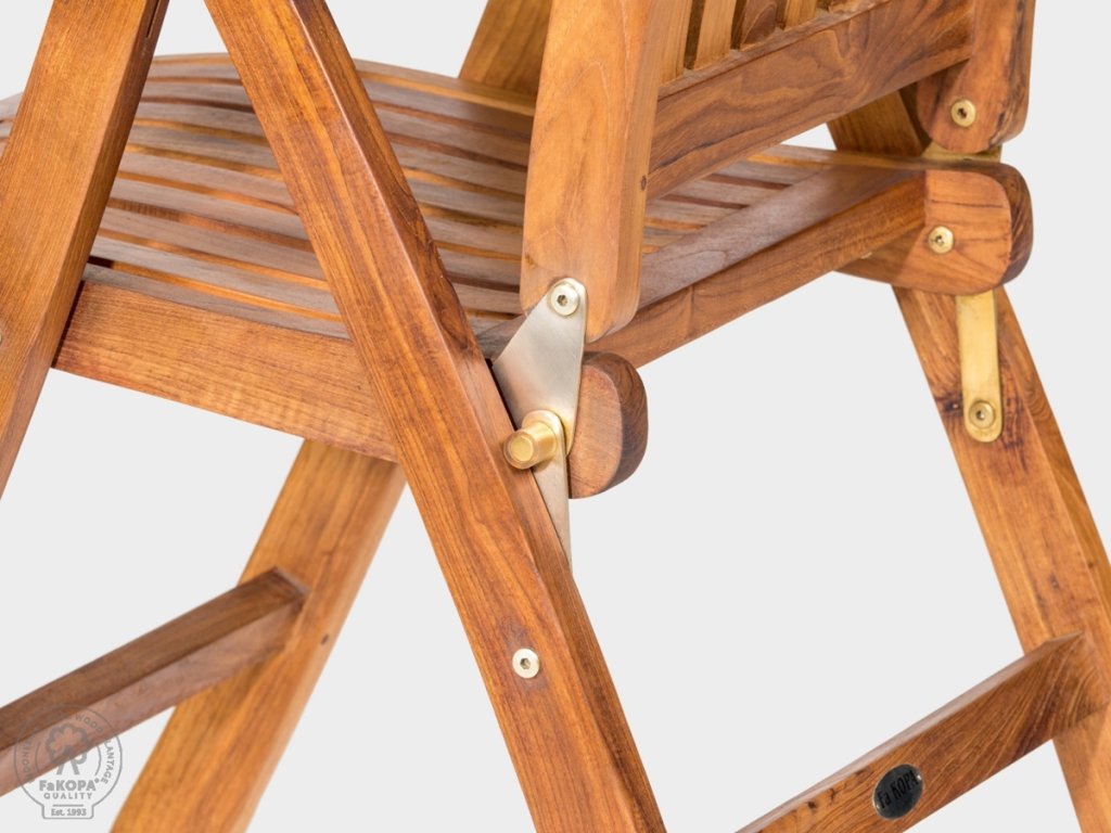Masivní skládací křeslo Riva ovýšce 110, šířce 60 a hloubce / délce 65 cm je vyrobené z kvalitního indonéského teaku.Pevnost, stabilita a design řadí tento typ křesla mezi nejkvalitnější na českém trhu. Na špičkové úrovni je především dílenské zpracování, zesílené nohy, zesílení rámu sedáku i opěradla, které bylo pečlivě anatomicky natvarováno pro vaše větší pohodlí. Zahradní křeslo Riva se velice snadno polohuje a lehce skládá. Samozřejmostí je i kvalitní mosazné kování. Nosnost teakového křesla je 150 kg.