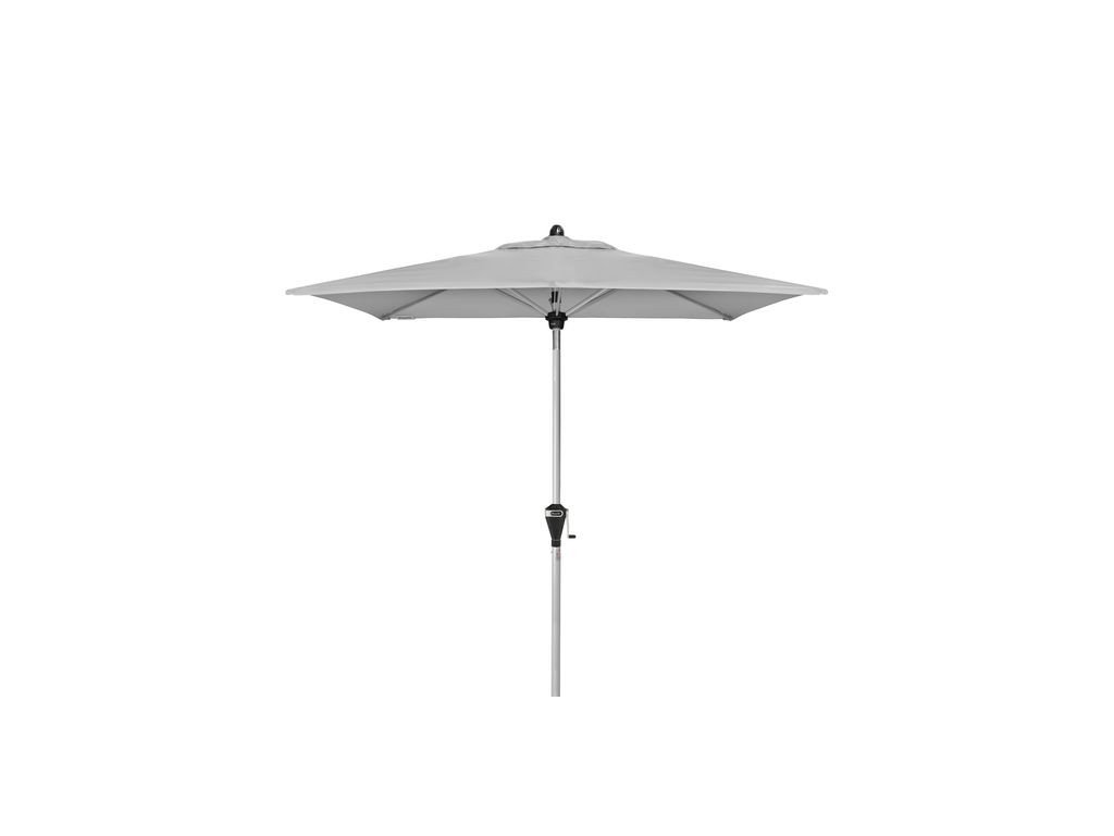 Obdélníkový slunečník Doppler o rozměru 210 x 140 cm s automatickým naklápěním. Otočný, tyč uprostřed, výškově nastavitelný, hliníková konstrukce. Barva světle šedá.