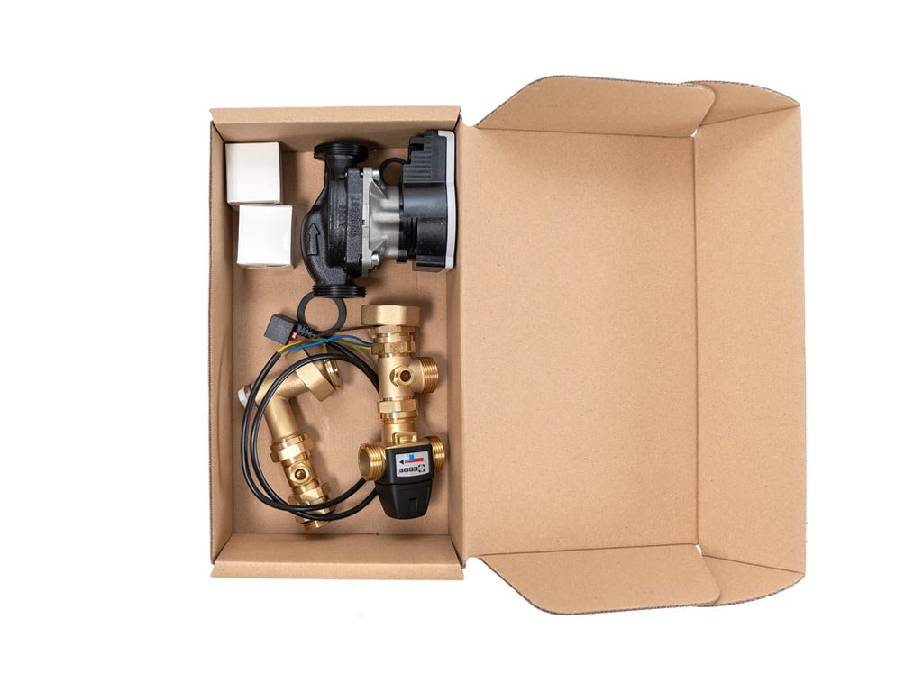 Kulový ventil červený mosazný 1" rohový se šroubením k rozdělovači. Balení obsahuje 2 červené kulové ventily . Teploměr není součástí balení.