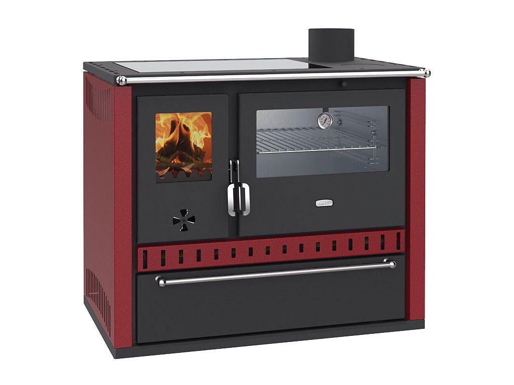 Sporák do kuchyně se sklokeramickou deskou PRITY GT FI G DR v bordó barvě s výkonem 15 kW s proskleným topeništěm, nerezovou pečící troubou, madlem a uzavíratelným prostorem pro skladování dřeva. Vývod kouřovodu - horní - pravý. Je schopen vytopit prostor o objemu až 300 m3.