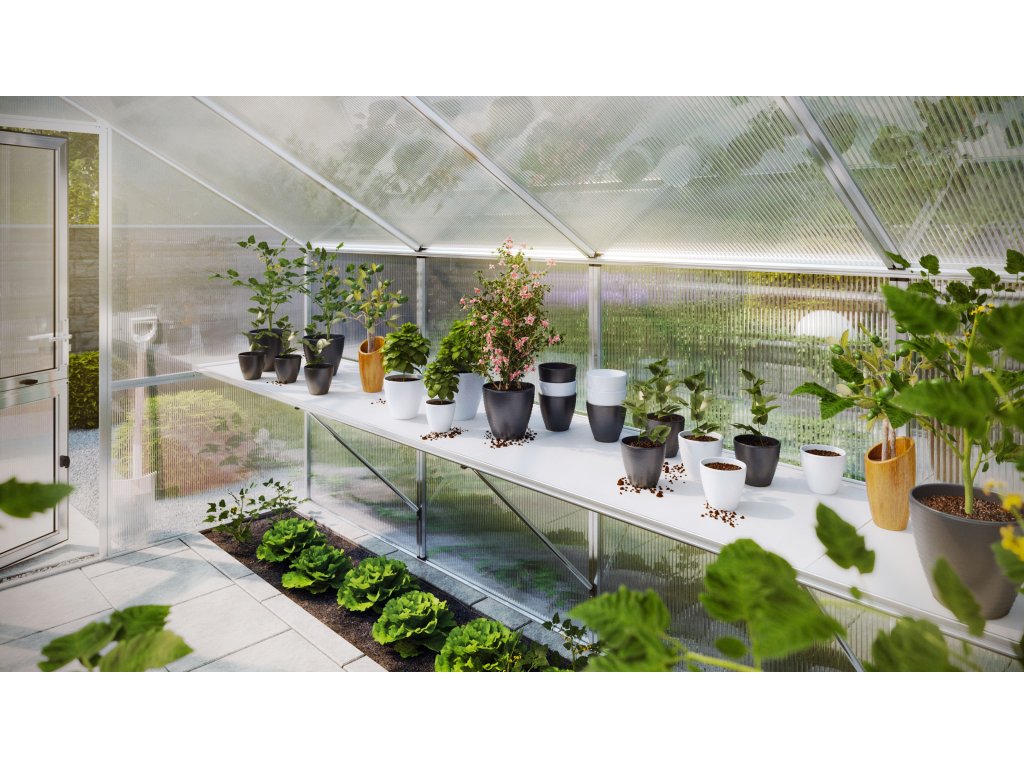 Praktický rám stolu KGT je vyroben z vysoce kvalitního hliníku a udržuje skleník v pořádku. Je vhodný například pro přesazování, setí a péči o rostliny. Běží podél celé boční stěny skleníku. Vysoce odolné bílé plastové police lze jednotlivě vyjmout a snadno vyčistit. Díky inteligentnímu upevnění ke skleníku jsou všechny nosné komponenty vysoce odolné. Hloubka rámu stolu je přibližně 63,5 cm.