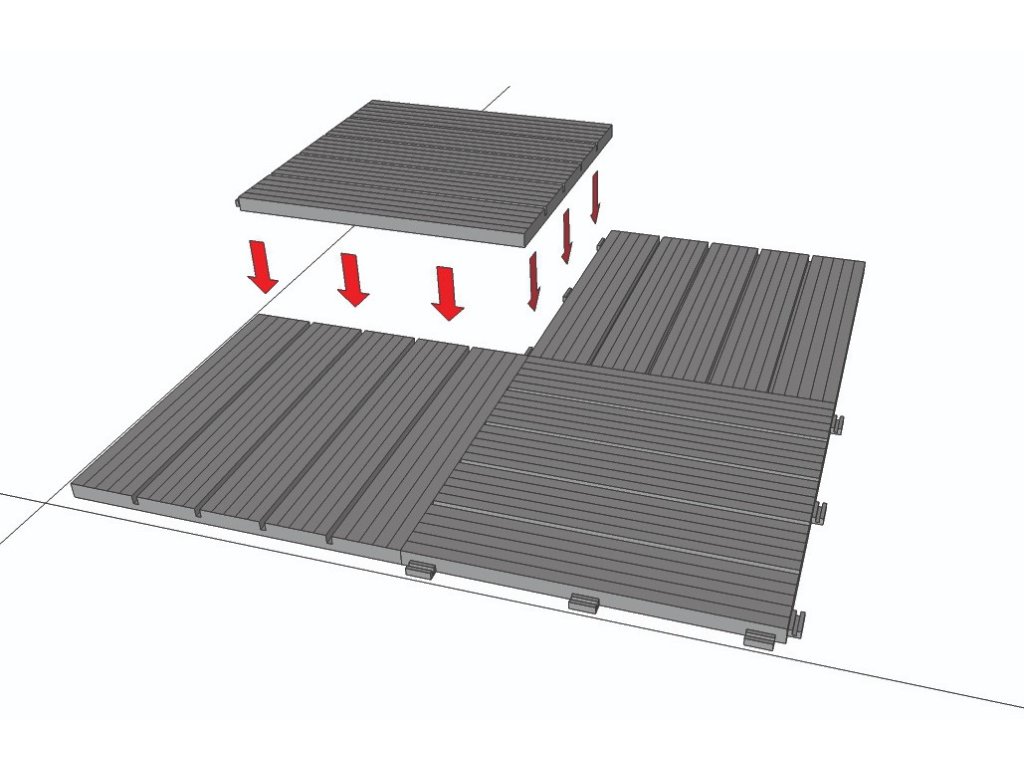 Podlahu můžete mít položenou během pár hodin nebo za jedno odpoledne – záleží na velikosti prostoru, kam dlažbu budete pokládat. Dlaždice mají praktické drážky, které slouží k odtoku přebytečné vody. Díky tomu se voda nehromadí mezi dlažbou a podkladem a nevzniká plíseň. Rovné dosedací plochy na spodní straně dlaždic nepoškozují hydroizolaci na vaší terase. Mezi izolaci a dlažbu nemusíte vkládat žádnou další tkaninu. Dlažba se upevňuje pomocí bočních spojovacích háčků, tzv. systémem Quick-Click. Přehledný návod si můžete stáhnout v souvisejících souborech.