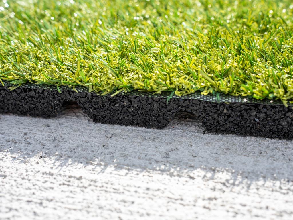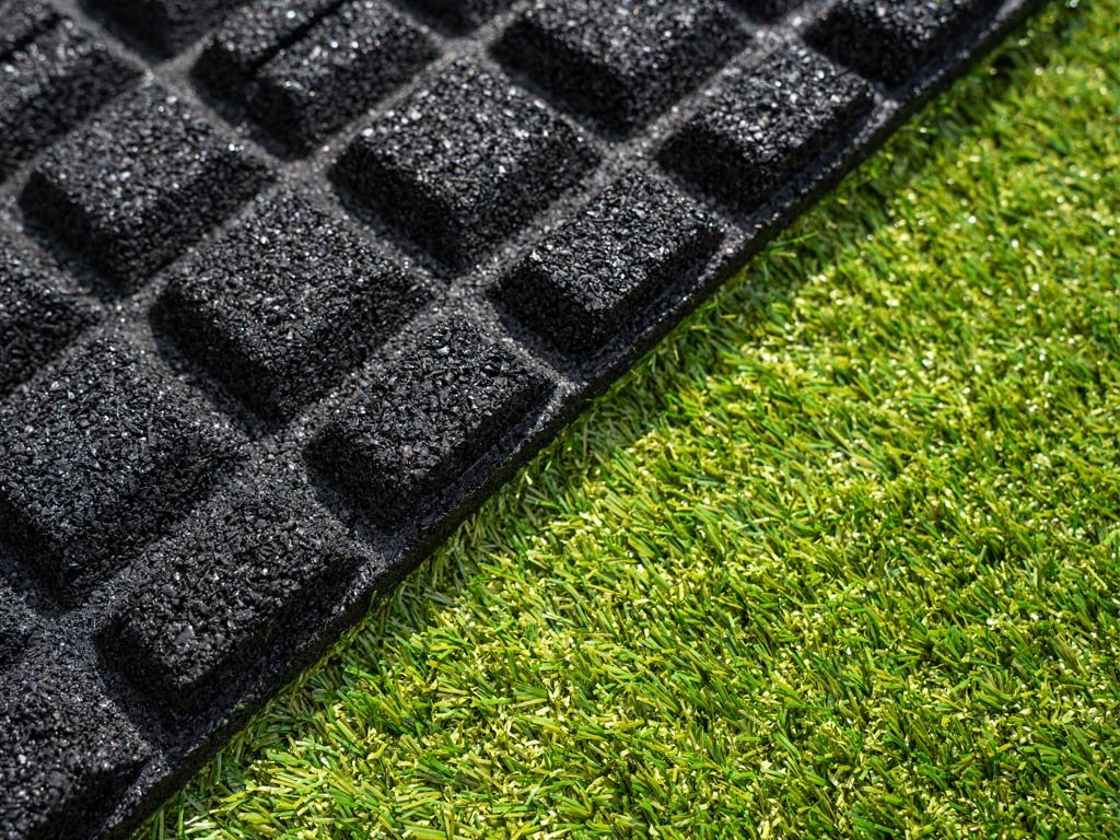 - Kombinace umělého trávníku a gumové dlaždice pro odolný a estetický povrch