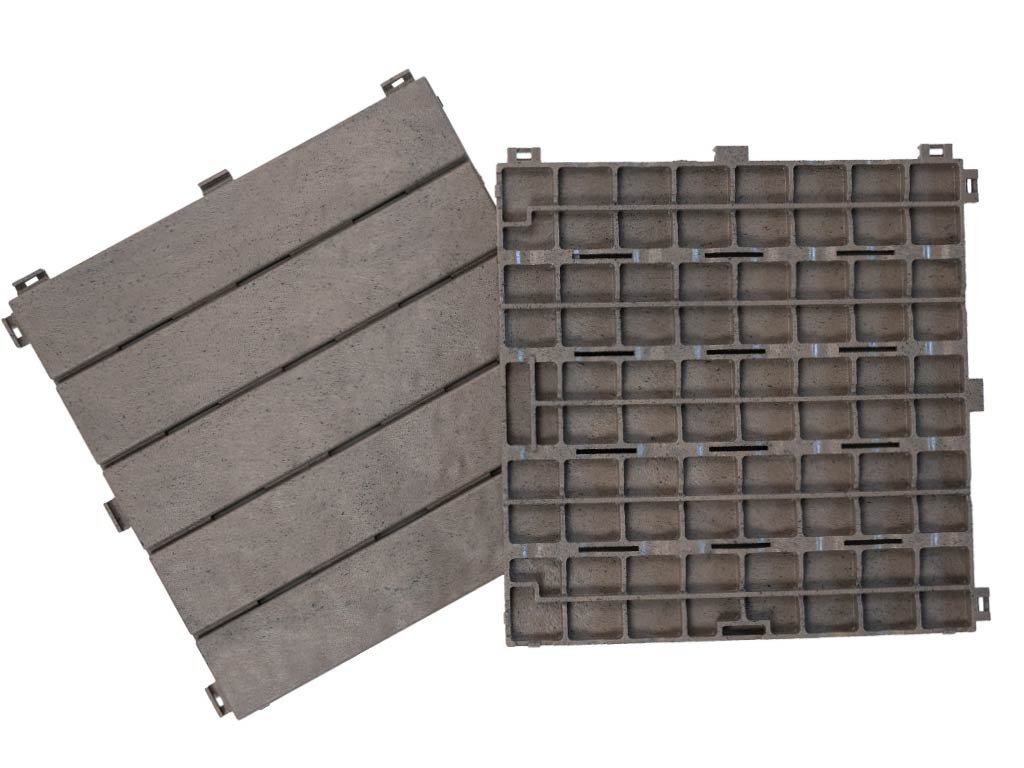 Vyrobeno ze 100% recyklované gumy a plastu (certifikace TÜV Nord). 1,5 cm vysoká dlaždice je odolná vůči povětrnostním vlivům po mnoho let. Můžete kombinovat dlaždice vertikálně nebo horizontálně a snadno z nich setřete nečistoty.