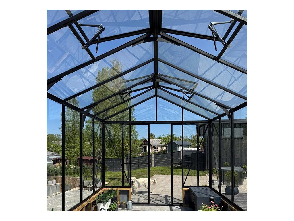 Skleník je vybaven manuálně otevíratelnými střešními okny pro efektivní větrání. Lze přidat automatické otevírače pro zajištění optimální teploty v průběhu dne. Integrované střešní ventilace zajišťují přirozený odvod tepla a vzduchu, což pomáhá regulovat vnitřní mikroklima a udržuje skleník v optimálních podmínkách pro růst rostlin. Možnost přidání dalších ventilací pro zvýšení cirkulace vzduchu, která je klíčová pro udržení správné teploty a vlhkosti.