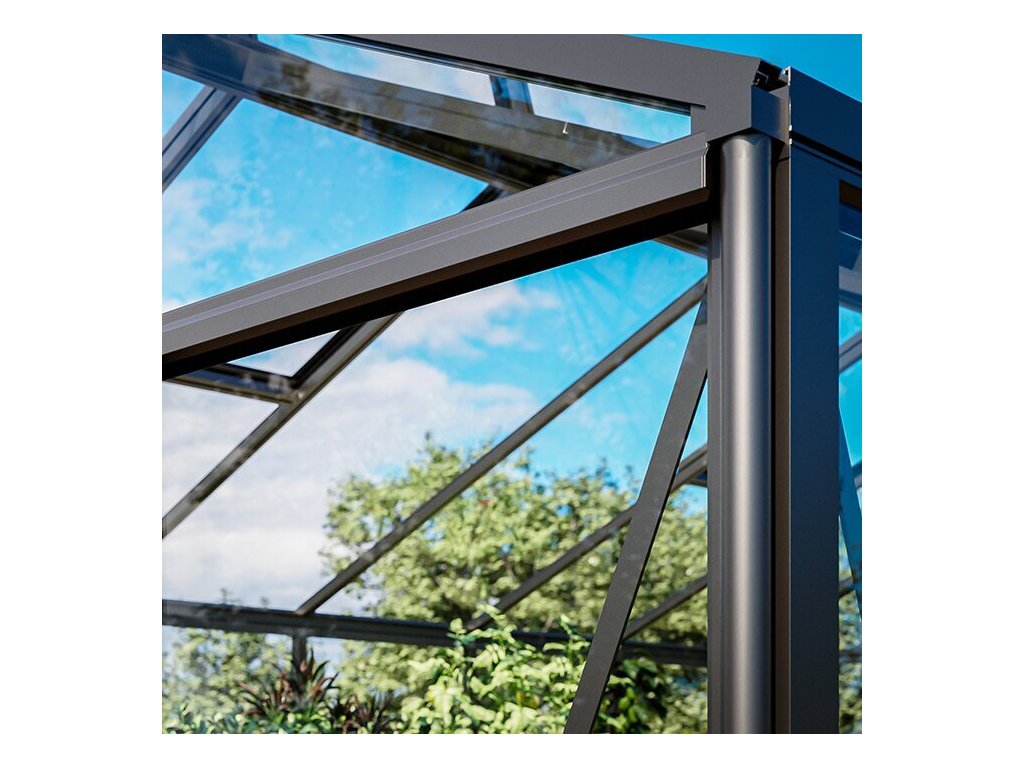 Základ skleníku tvoří lehká, ale pevná a propracovaná konstrukce z hliníkových profilů, které jsou přirozeně odolné vůči korozi, dlouhodobě nenáročné na údržbu a dobře snášejí běžné venkovní podmínky. Hliník zároveň umožňuje přesné lícování dílů, volbu různých typů zasklení a přizpůsobení konstrukce i vzhledu podle individuálních potřeb. Výsledkem je stabilní a prvotřídní provedení, doložené 12letou zárukou na hliníkový rám, použitím systémových extrudovaných profilů a integrovaným okapovým systémem, který zvyšuje tuhost celé konstrukce.