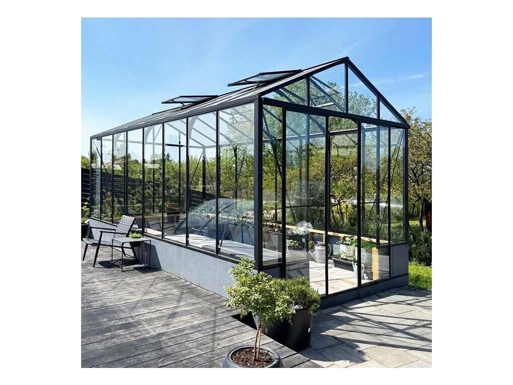 Italica 6,1 × 2,4 m se zasklením sklo 4 mm vyniká konstrukcí určenou na podezdívku, která zvedne pěstování do komfortní výšky. Posuvné dveře (výška 165 cm) a individuální barvu RAL podtrhují prvotřídní zpracování.