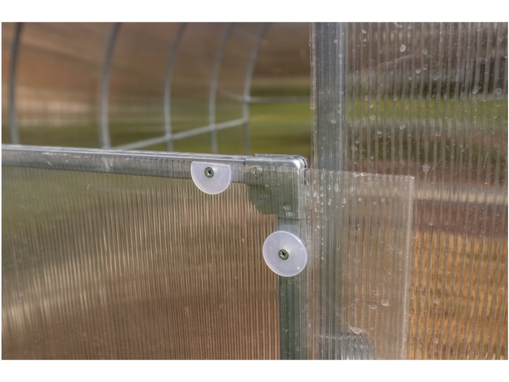 Zasklení skleníku je tvořeno čirým dutinkovým (komůrkovým) polykarbonátem o tloušťce 6 mm s UV ochranou, který má zvýšené tepelně izolační vlastnosti, oproti běžně prodávaným skleníkům. Polykarbonát splňuje veškeré podmínky zdravotní nezávadnosti.