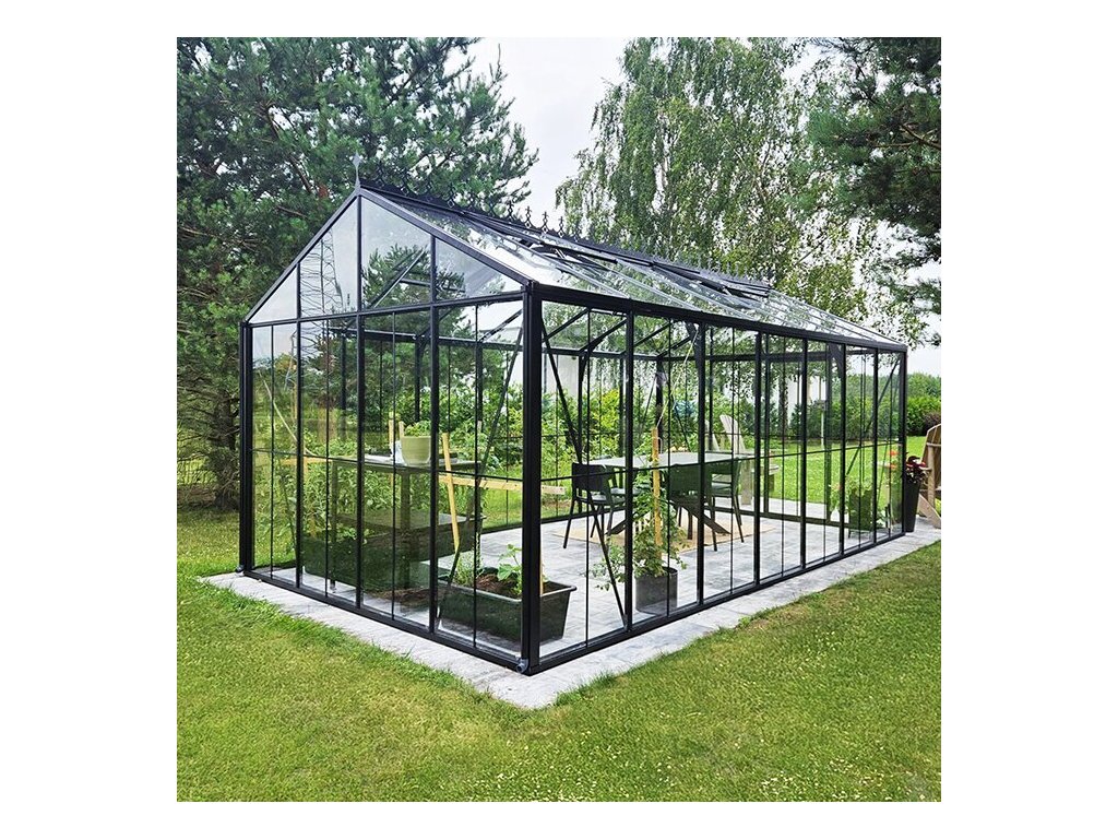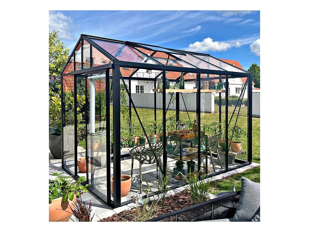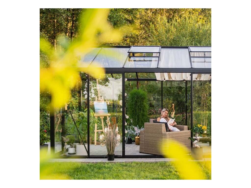 Skleník Antica v rozměru 3,1 × 3,1 m je osazen PC 6 mm a zaujme širokými možnostmi konfigurace na míru (zasklení i barva). Díky posuvným dveřím výška 185 cm a individuální barvu RAL působí prémiové provedení.