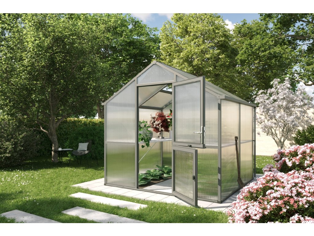 Skleník Iris je dostupný ve třech barevných variantách: přírodní hliník, jedlově zelená (RAL 6009) a antracitově šedá (DB 703). Díky tomu si můžete vybrat design, který nejlépe zapadne do vaší zahrady.
