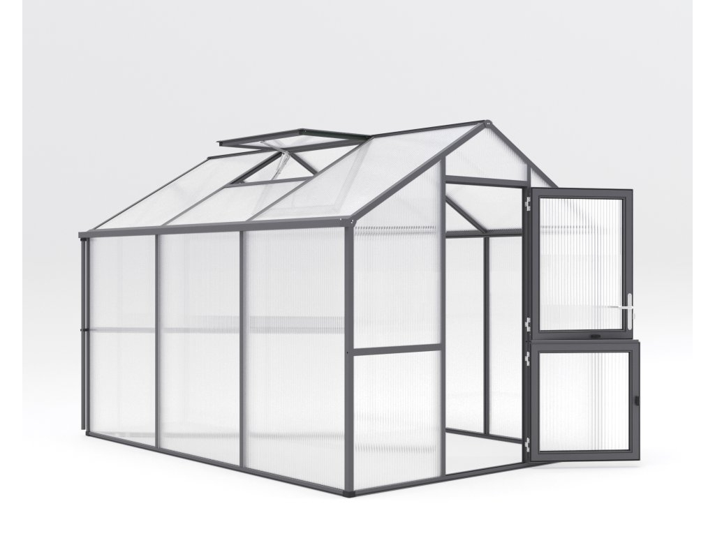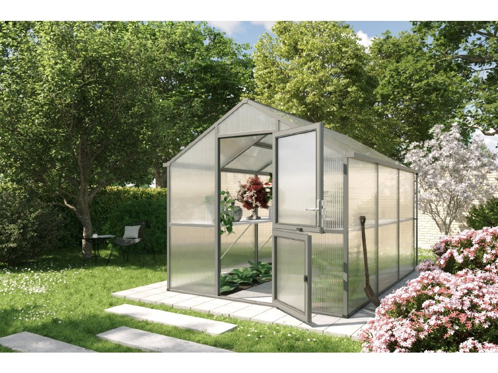Skleník Iris je dostupný ve třech barevných variantách: přírodní hliník, jedlově zelená (RAL 6009) a antracitově šedá (DB 703). Díky tomu si můžete vybrat design, který nejlépe zapadne do vaší zahrady.