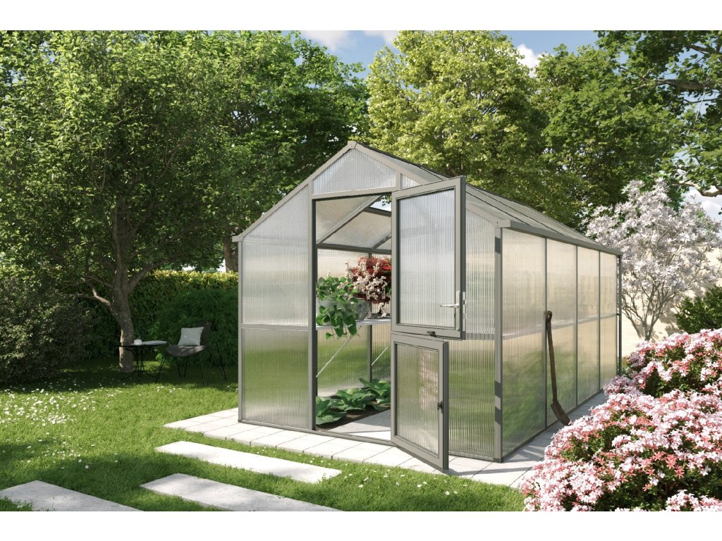 Skleník Iris je dostupný ve třech barevných variantách: přírodní hliník, jedlově zelená (RAL 6009) a antracitově šedá (DB 703). Díky tomu si můžete vybrat design, který nejlépe zapadne do vaší zahrady.