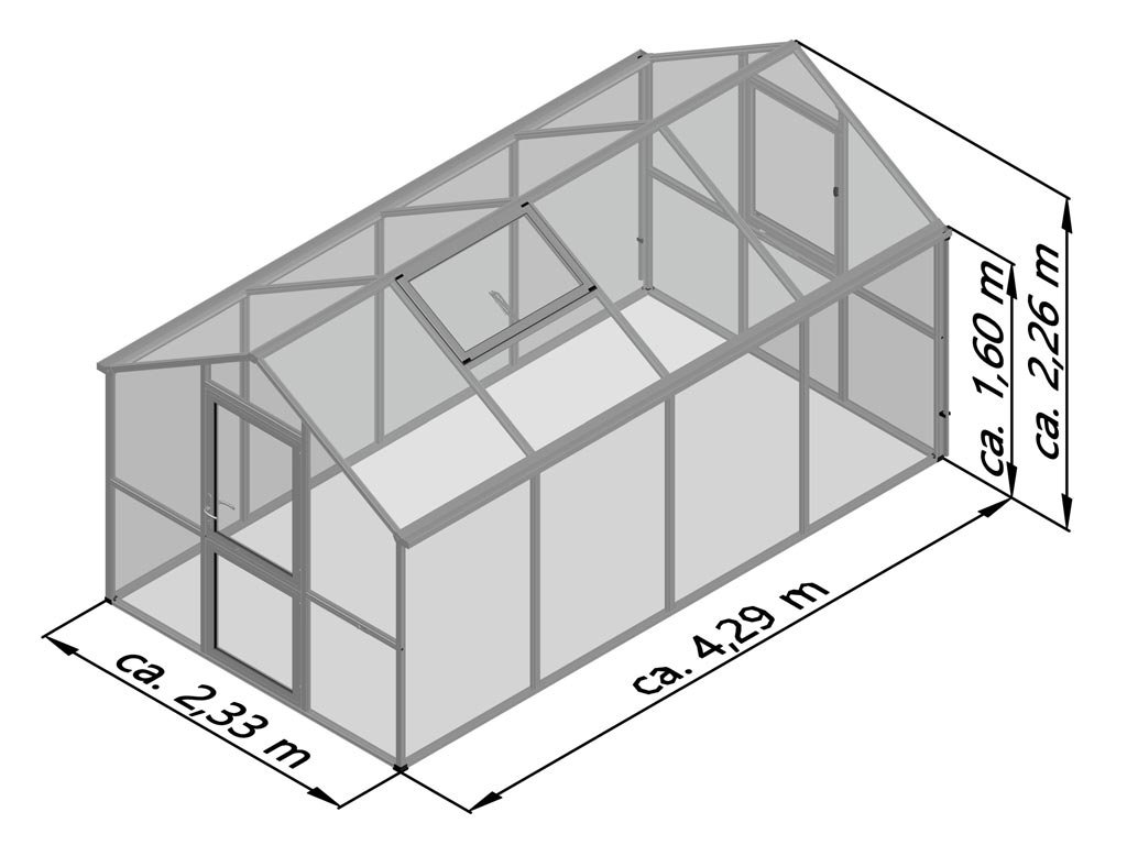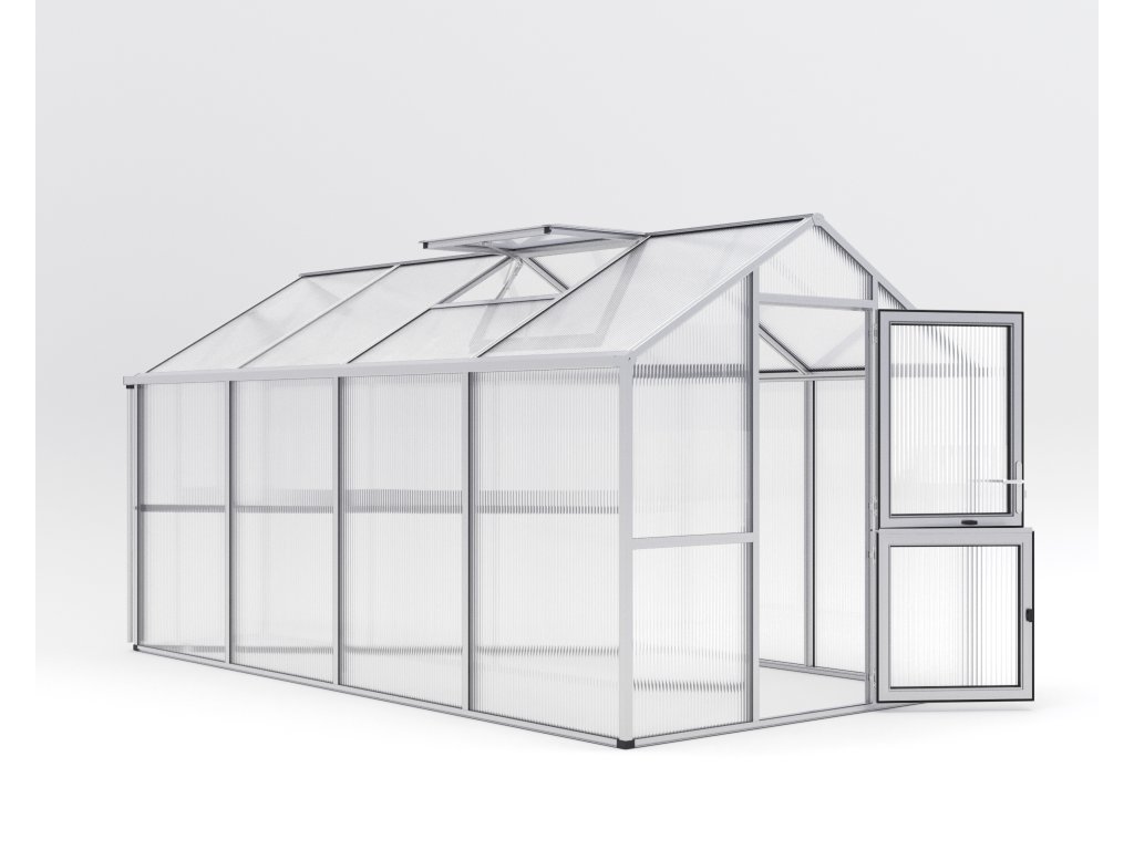 Pohodlná výška stěny 1,60 m usnadňuje stání a práci ve vzpřímené poloze. To znamená, že rajčata a okurky mohou bez problémů růst do výšky a plně se rozvíjet. Robustní hliníková konstrukce spolu s 16 mm komůrkovými deskami ISO zajišťují optimální stabilitu. Praktické okapy s odtoky na obou stranách umožní svod dešťové vody do sudu.