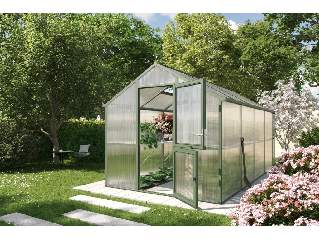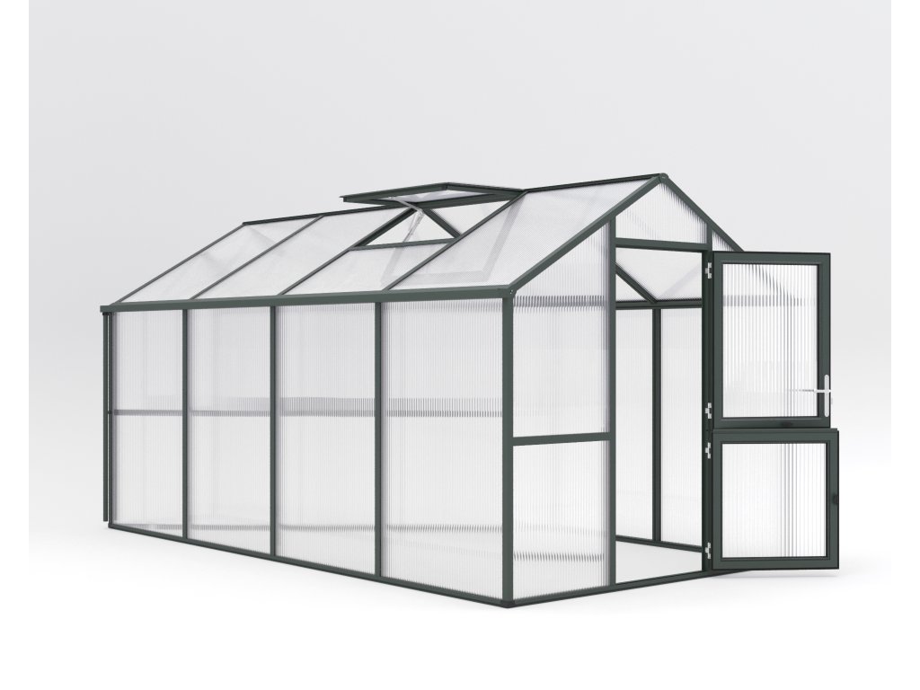 Skleník Iris je dostupný ve třech barevných variantách: přírodní hliník, jedlově zelená (RAL 6009) a antracitově šedá (DB 703). Díky tomu si můžete vybrat design, který nejlépe zapadne do vaší zahrady.