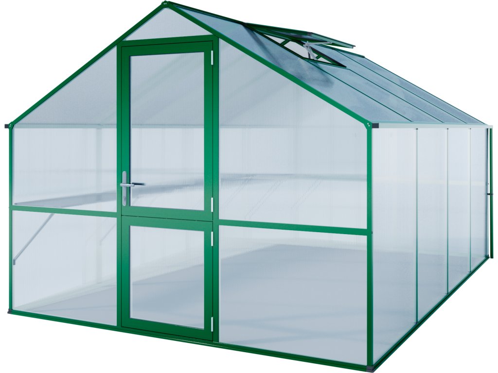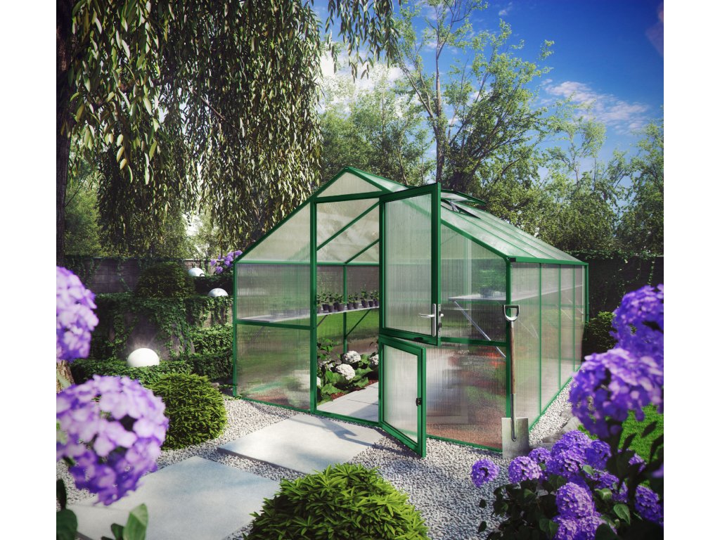 Mimořádně kvalitní skleník KGT Orchidee IV německé výroby v zelené barvě o rozměrech 4,3 x 3 m poskytuje prodlouženou záruku a velkorysý prostor. Dvojité desky nepropouštějí UV záření, takže vaše rostliny jsou chráněny před spálením a stínění není obecně nutné. Další velkou výhodou je jejich vysoká izolační hodnota, díky níž se užitečné teplo udržuje ve skleníku mnohem déle.