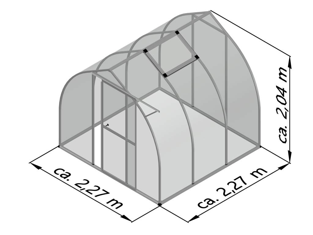 Hliníkový skleník KGT Rhodo III 2,27 × 2,27 m (přírodní hliník) je ideálním základním modelem ve světě skleníků. Obloukový tvar „cibule“ zajišťuje obzvláště dobrý přísun světla. Kromě širokých, hladce posuvných dveří má skleník také střešní okno s ručním otevíráním, které zajišťuje optimální větrání pro vaše rostliny. Robustní hliníková konstrukce a průhledné, tepelně izolační dvojité stěny ISO z polykarbonátu o tloušťce 6 mm poskytují skleníku stabilitu a odolnost. Skleník je ideální pro rané jarní pěstování i celou sezónu.