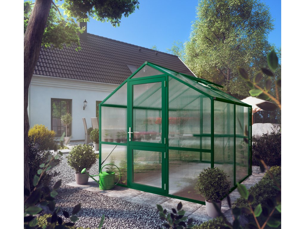 Hliníkový model skleníku KGT Rose II německé výroby v zelené barvě o rozměrech 2,2 x 2,3 m poskytuje prodlouženou záruku. Průhledné dvojité stěny ISO mají tloušťku 10 mm a jsou zcela uzavřeny profily, takže desky nemohou létat kolem. Kromě dělených otočných dveří a okna v zadní stěně s ručním otevíráním má skleník Rose také střešní okno s automatickým otevíráním.