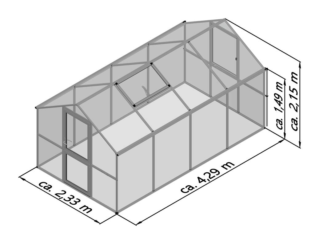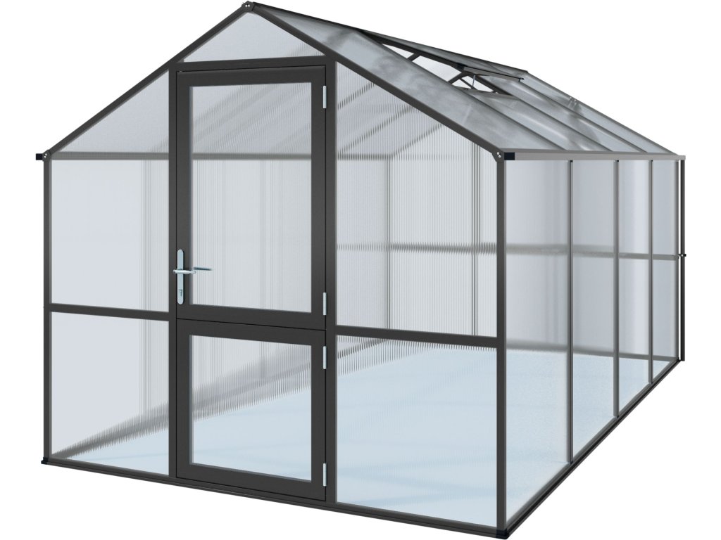 Hliníkový model skleníku KGT Rose IV německé výroby v barvě antracit o rozměrech 4,2 x 2,3 m poskytuje prodlouženou záruku. Průhledné dvojité stěny ISO mají tloušťku 10 mm a jsou zcela uzavřeny profily, takže desky nemohou létat kolem. Kromě dělených otočných dveří a okna v zadní stěně s ručním otevíráním má skleník Rose také střešní okno s automatickým otevíráním.