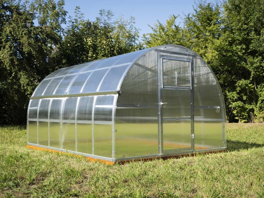 Zasklení skleníku je tvořeno čirým dutinkovým (komůrkovým) polykarbonátem o tloušťce 4 mm s UV ochranou, která zamezuje křehnutí materiálu a změně barvy. Polykarbonát je samozřejmě certifikovaný a splňuje veškeré podmínky zdravotní nezávadnosti.