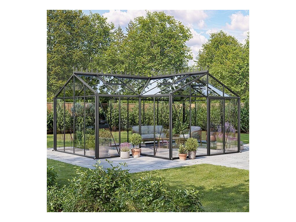 Hliníkový skleník Roma (6,1 × 4,6 m, sklo 4 mm) sází na členěním, které vytváří samostatné zóny pod sklem. prémiové provedení, posuvné dveře výška 185 cm a individuální barvu RAL.