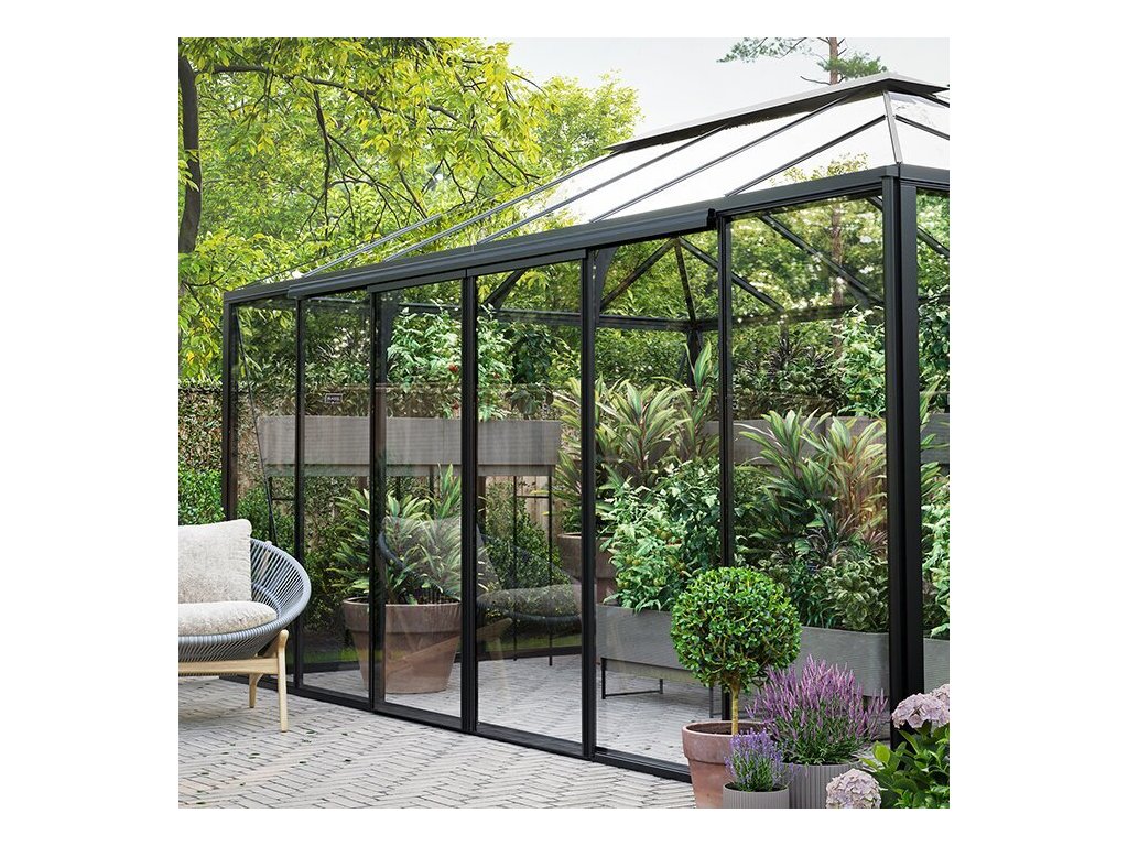 Skleník je v základním provedení vybaven posuvnými dveřmi, které jsou navrženy pro plynulý chod a každodenní pohodlné používání. Kromě základních dveří je možné dokoupit další posuvné dveře a umístit je na přední, zadní nebo boční stěny skleníku, čímž lze výrazně zvýšit komfort, přístupnost i možnosti větrání. Na výběr jsou jednokřídlé posuvné dveře, a to včetně variant s uzamykáním.