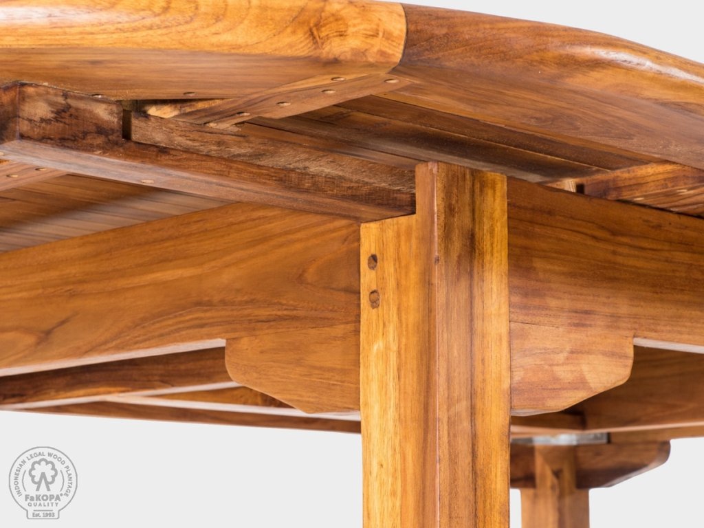 Oválný rozkládací stůl Elegante má špičkově provedené spoje. Švédská nerezová spona, fixace jednotlivých lamel a rybinový zámek zajišťují maximální stabilitu. Deska zahradního stolu má tloušťku 3,5 cm. Nohy stolu jsou chráněny plastovými krytkami. Otvor pro slunečník je zakryt mosaznou zátkou. Stůl je možné ze základního rozměru 160 cm zvětšit až na rozměr 220 cm. Stůl je ošetřen teakovým olejem.