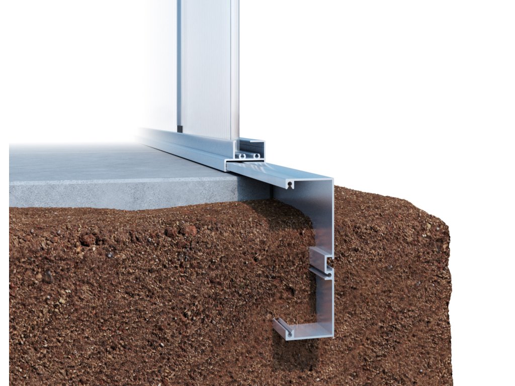 Hliníkový základový rám je užitečným doplňkem. Pokud nechcete skleník upevňovat pomocí šroubů a hmoždinek nebo pokud k tomu není vhodný povrch, základový rám zajistí stabilní spojení mezi skleníkem a zemí. Základový rám se zahákne pod zemní profil a poté se jednoduše zakope do země. Tím se vytvoří bezpečné, všestranné spojení se zemí. Ušetřete si čas a práci s vytvářením betonového základu a použijte volitelný hliníkový základový rám. Základový rám je vyroben z hliníku odolného proti hnilobě a lze jej i po letech odstranit bez zanechání stop.