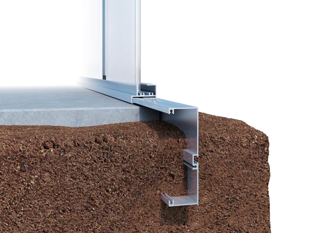 Hliníkový základový rám je užitečným doplňkem. Pokud nechcete skleník upevňovat pomocí šroubů a hmoždinek nebo pokud k tomu není vhodný povrch, základový rám zajistí stabilní spojení mezi skleníkem a zemí. Základový rám se zahákne pod zemní profil a poté se jednoduše zakope do země. Tím se vytvoří bezpečné, všestranné spojení se zemí. Ušetřete si čas a práci s vytvářením betonového základu a použijte volitelný hliníkový základový rám. Základový rám je vyroben z hliníku odolného proti hnilobě a lze jej i po letech odstranit bez zanechání stop.